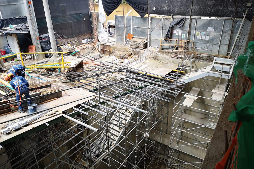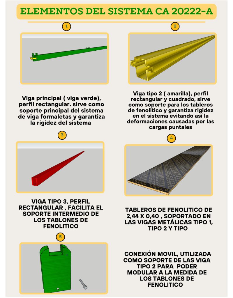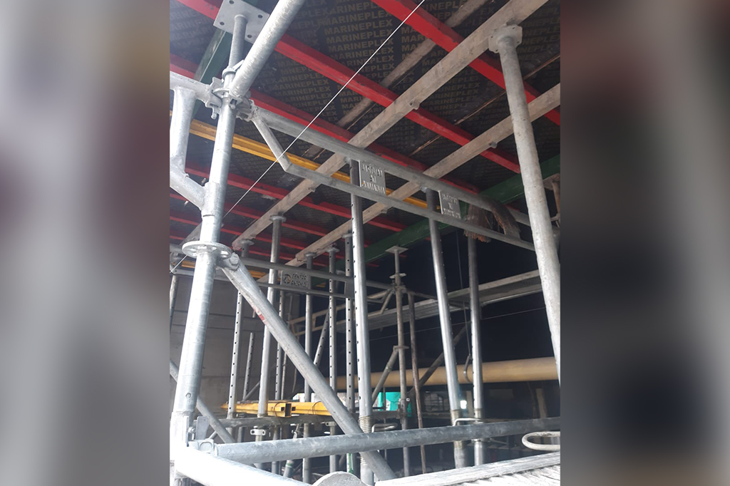 Contamos con encofrado metálico y de madera para moldear el hormigón fresco y formar la placa.En algunos casos es compuesto por elementos de andamio multidireccional que funciona como apuntalamiento.